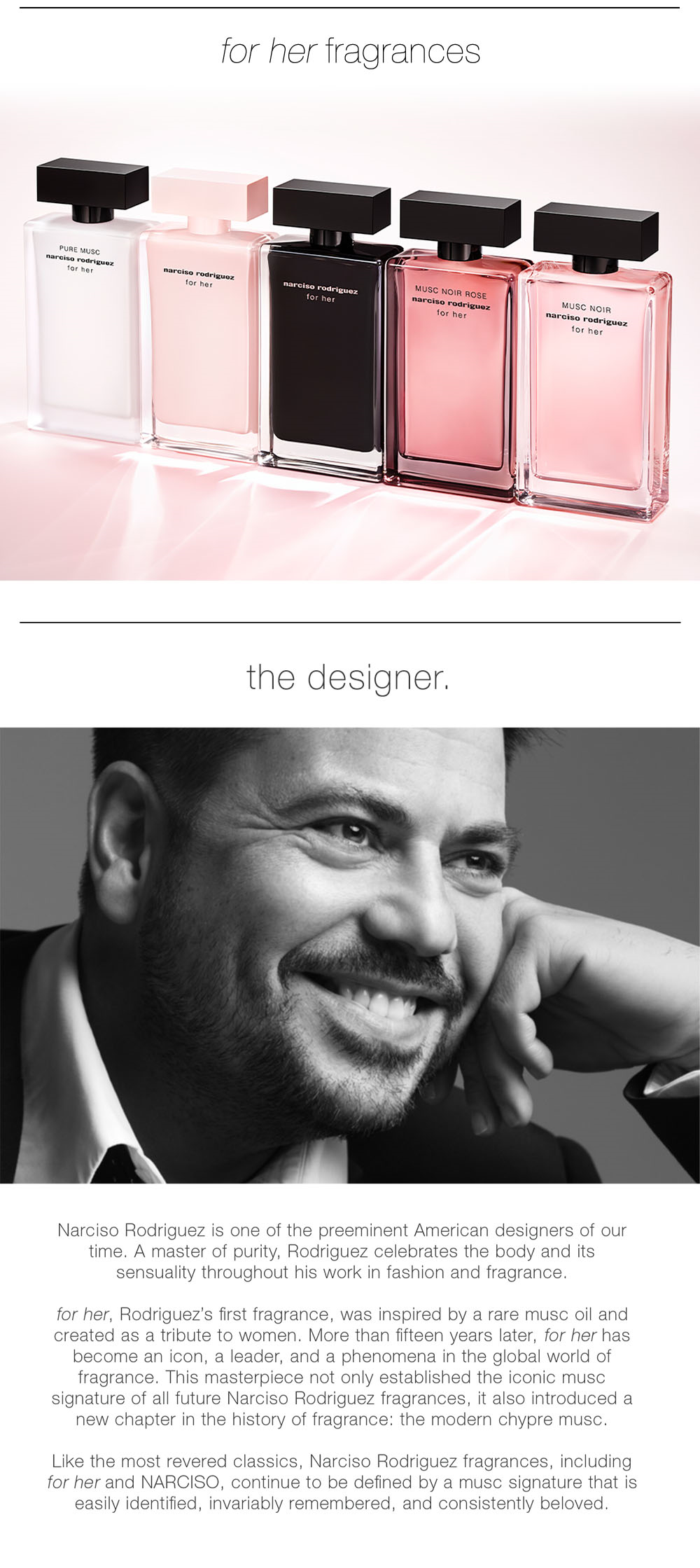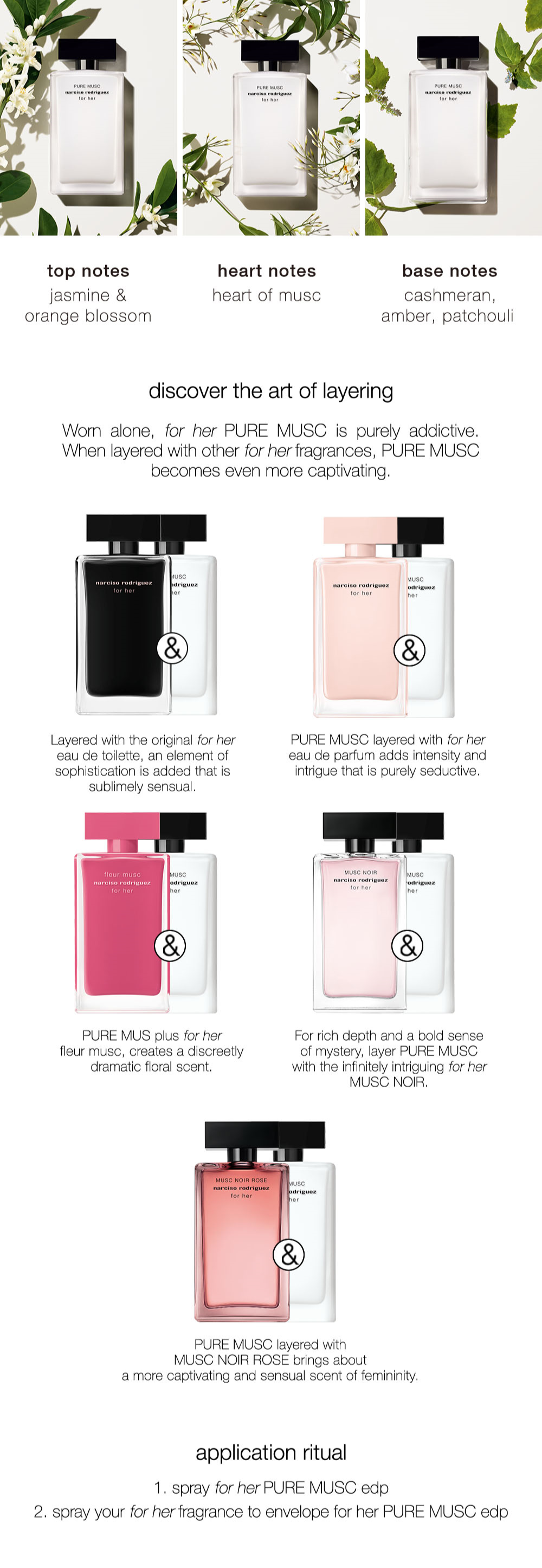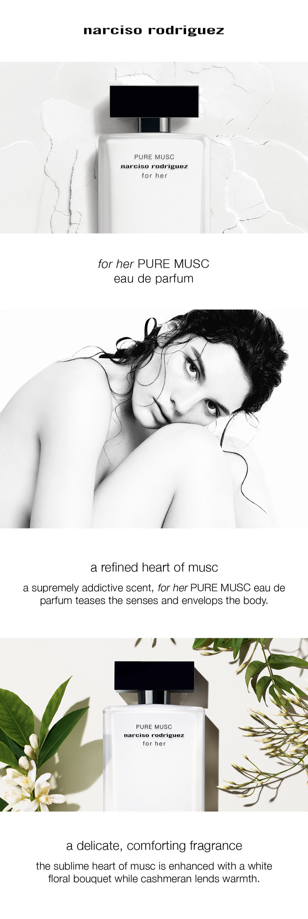 A singular olfactive composition renders the dual nature of a woman anew with a heightened immediacy. narciso rodriguez’s signature musc is reinterpreted and refined with a disarming purity and a rich depth. The sublime heart of musc is enhanced with a white floral bouquet while cashmeran lends warmth. A supremely addictive scent, for her PURE MUSC eau de parfum teases the senses and envelops the body.
