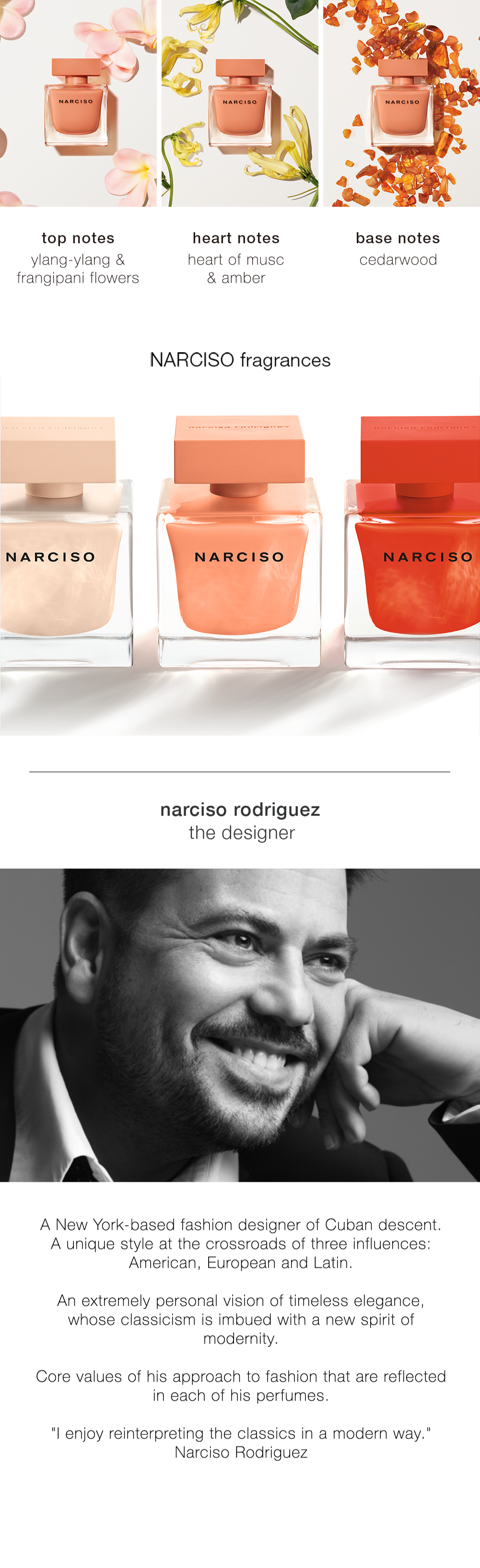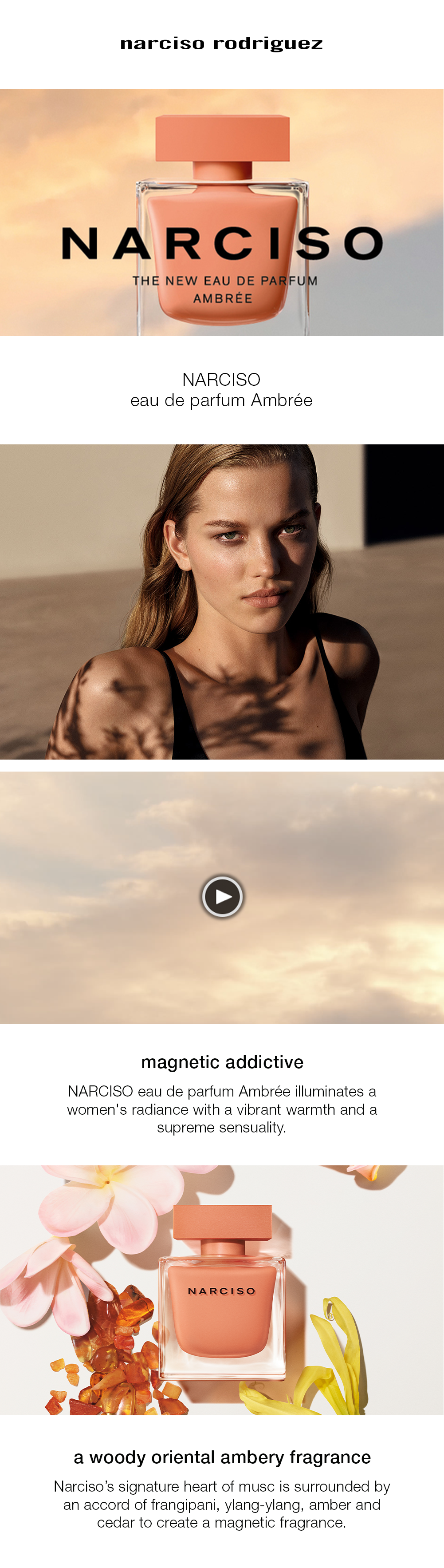 NARCISO eau de parfum ambrée illuminates a woman’s radiance with a vibrant warmth and a supreme sensuality. The alchemy of attraction rekindled: NARCISO eau de parfum ambrée lends a beautiful luminosity and an irresistible power. Narciso Rodriguez’s signature musc, the sultry heart of the new fragrance, is illuminated by a warm amber accord and enhanced by exotic floral notes of Madagascar, frangipani and ylang-ylang; vivid notes of cedar wood and cashmeran add depth and richness. the result: an intoxicating light-infused fragrance seduces magically and mysteriously.